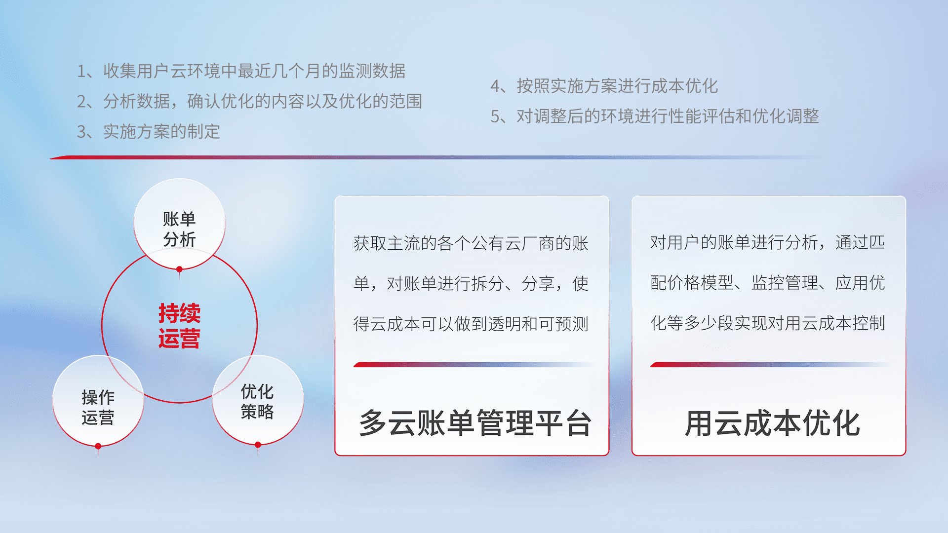 通过多云纳管,,以统一的资源数据模型把客户的云资源进行抽象和封装,,,进而实现对多云资源的统一操作,,,保障云资源管理的可靠性、、稳定性与可用性。。。量身定制化运维内容,,配置、、开发运维、、、补丁管理、、、、备份、、、监控、、认证和访问管理、、、审计和日常巡检等,,,保障在用云过程中的可靠度,,,,稳定度以及高可用率。。。